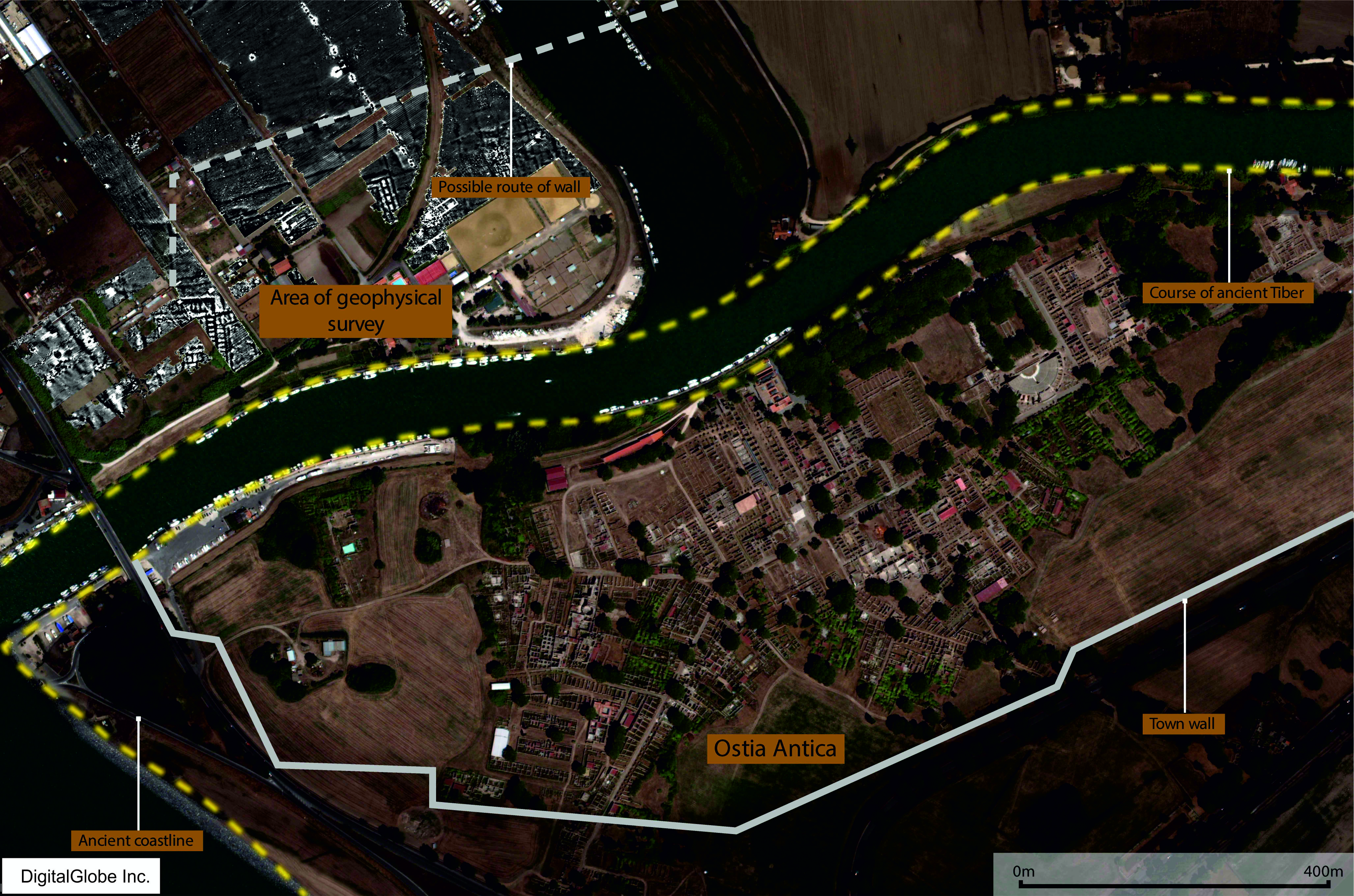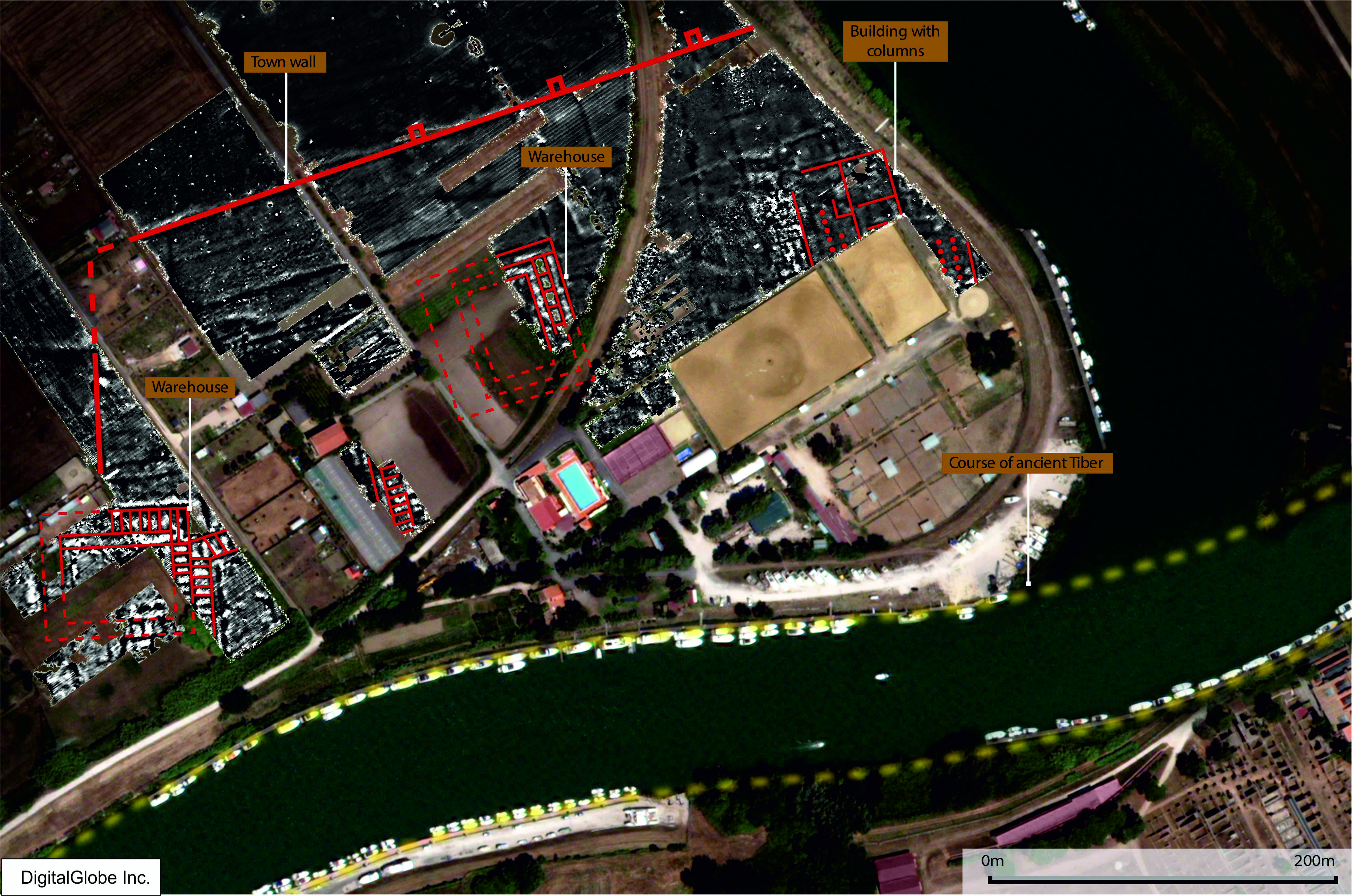 Newly discovered features at Ostia (Satellite imagery courtesy of Digital Globe Inc)